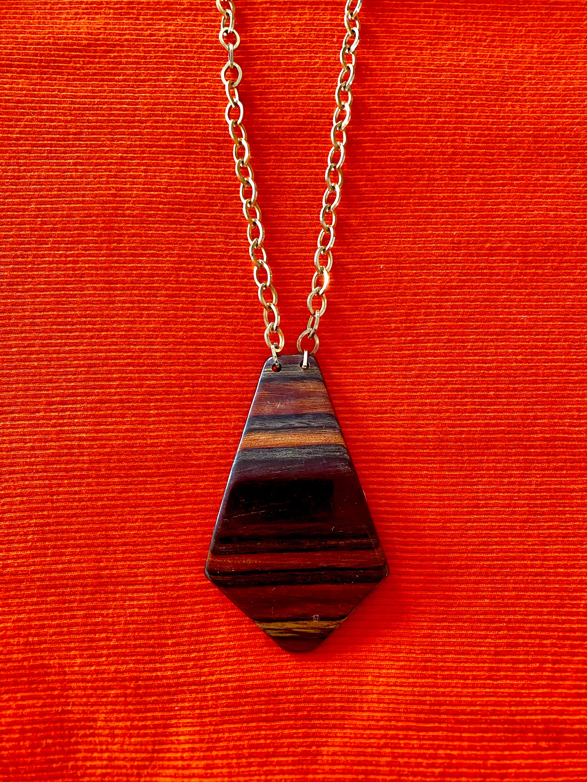 This stunning pendant necklace is created upon a wooden base, hung from a durable deep gold tone chain, to form an eye-catching necklace.