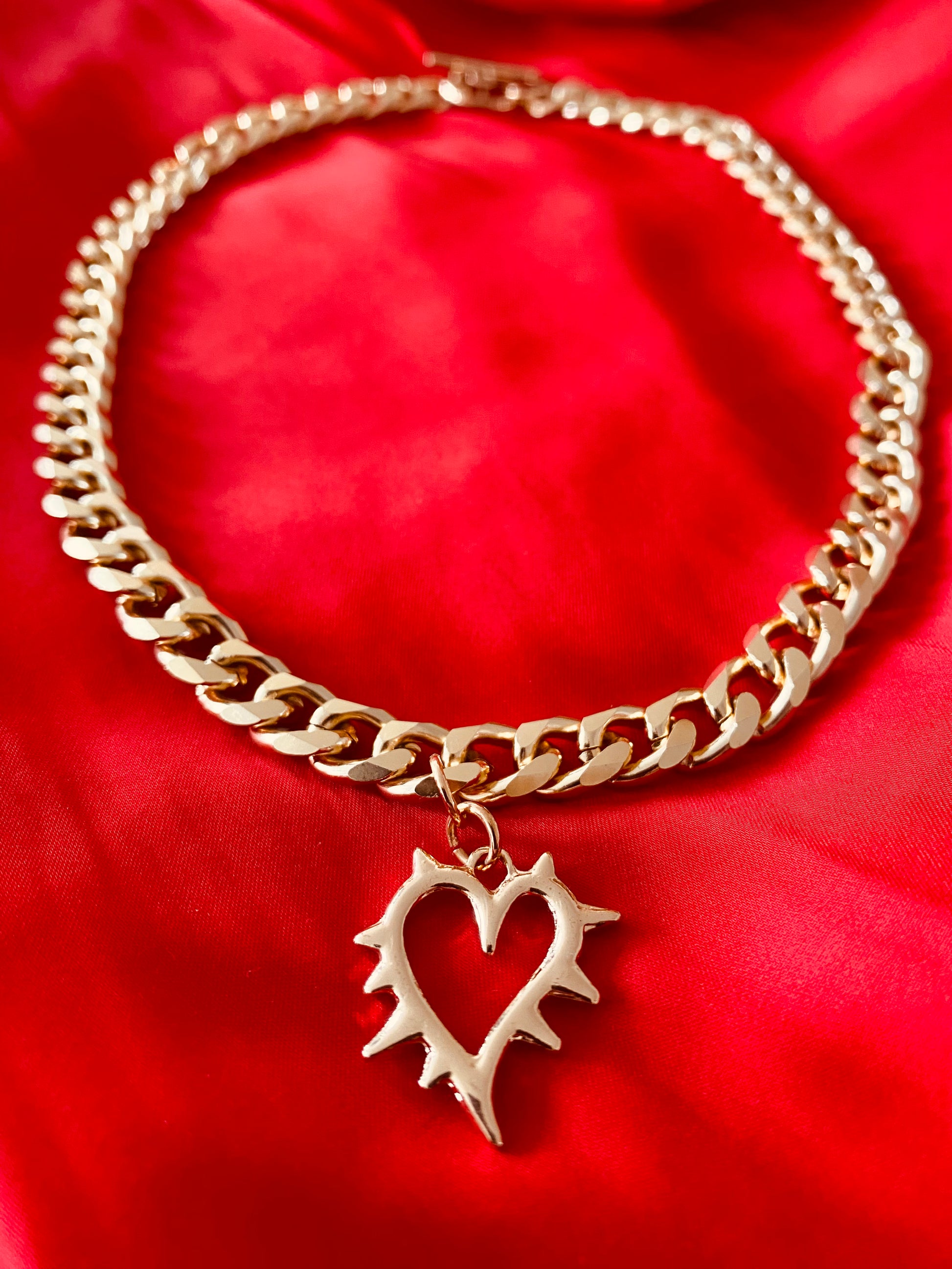 The spiked edge heart is an eye-catching centrepiece, measuring approximately 25mm. The gold plated chunky curb chain length measures approximately 17” and so sits beautifully just below the collarbone.
